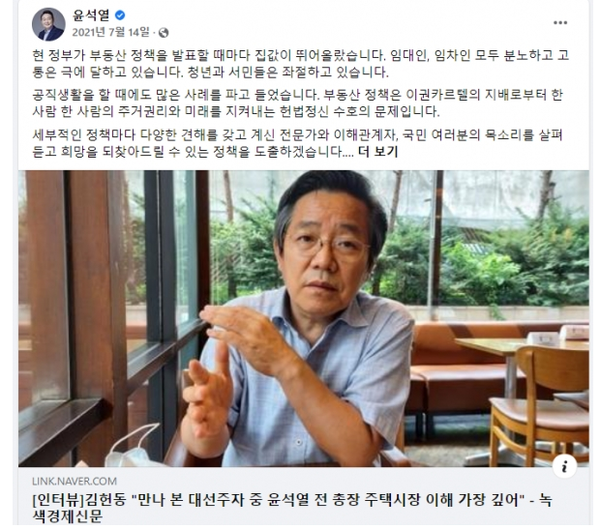 윤 대통령은 당시 자신의 SNS에"정부가 부동산 정책을 발표할 때마다 집값이 뛰어올랐다. 임대인, 임차인 모두 분노하고 고통은 극에 달하고 있다. 청년과 서민들은 좌절하고 있다"면서" 부동산 정책은 이권 카르텔의 지배로부터 한 사람 한 사람의 주거 권리와 미래를 지켜내는 헌법정신 수호의 문제"라고 직접 밝혔다.